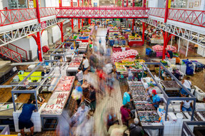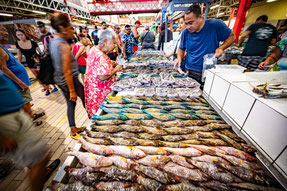 Photo 2 : Le rythme du marché. Le jour se lève, le public arrive et circule entre les étals de poissons.