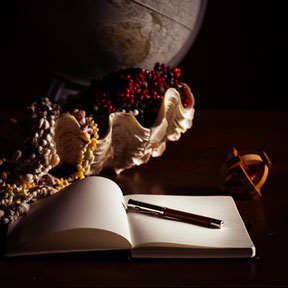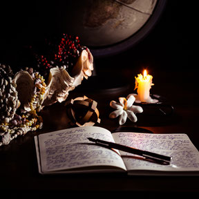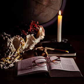 Les recherches font partie du processus de création. Les lunettes, le livre ouvert symbolisent la connaissance. La bougie évoque les longues heures de lecture souvent tard dans la nuit.